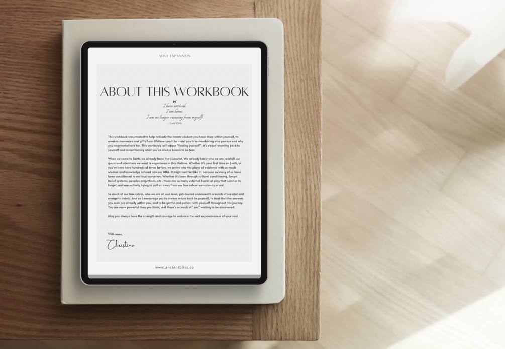 This 98 page workbook explores foundational practices to journey back yourself. Sectioned into 6 "Gateways" (Nature, Meditation, Music, Movement, Community, & Self), each gateway inviting you deeper and deeper into yourself with journal prompts, words of wisdom, guided practices, advice, and recommendations.